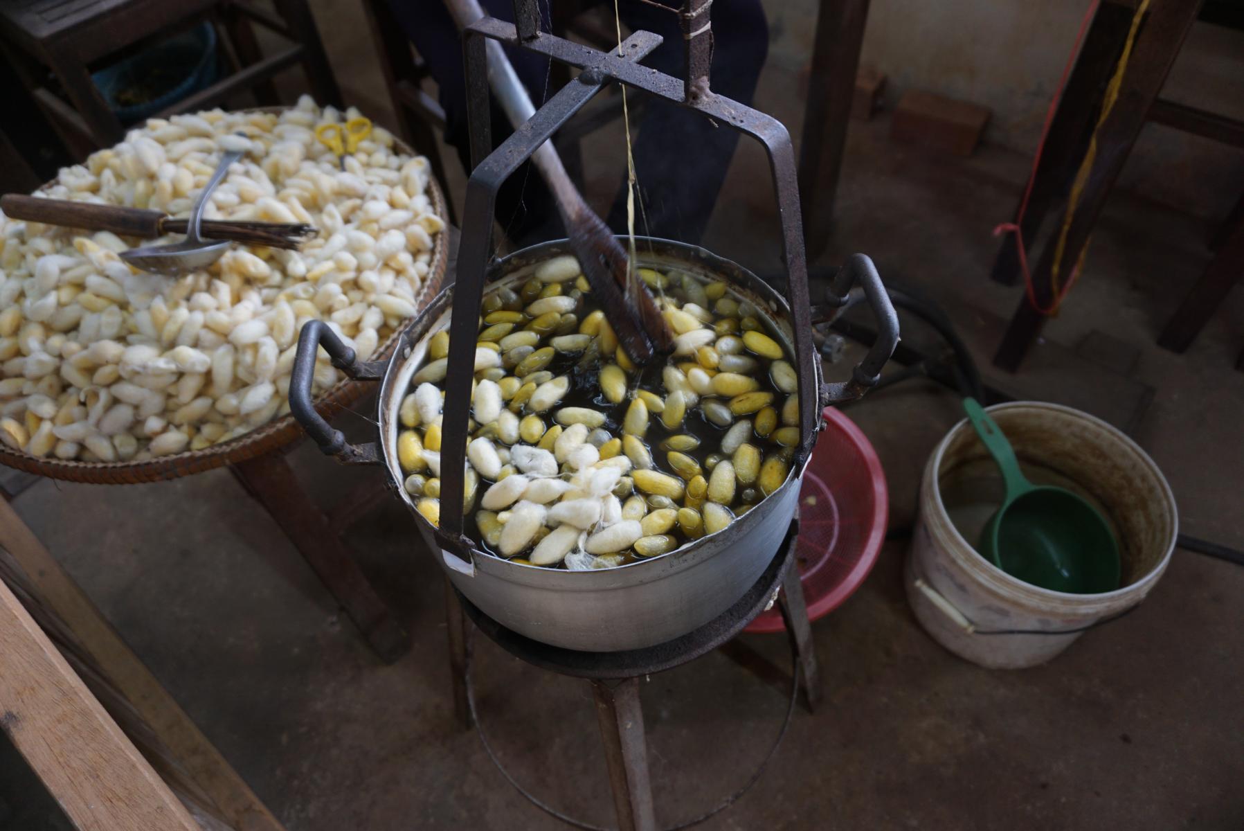 Die Suche nach der Seidenfarm gestaltet sich etwas schwierig. Niemand spricht englisch, unsere Reise geht über Stock und Stein, an einfachen Holzhäusern vorbei. Es kommt einem vor, durch die Wohnzimmer zu fahren – ein etwas voyeuristisches Gefühl. Endlich finden wir den Eingang. Die Raupen werden mit Maulbeerbaumblätter gefüttert, wenn sie an den Bäumen wären, ihr Dasein würde schnell im Rachen der Vögel enden. Die Besichtigung der verschiedenen Etappen der Seidenraupe bis zum Seidenschal ist sehr eindrücklich. 300 Frauen werden jedes Jahr zu Seidenweberinnen ausgebildet, ein wertvolles Projekt zur Verbesserung der Wirtschaftslage von Familien.