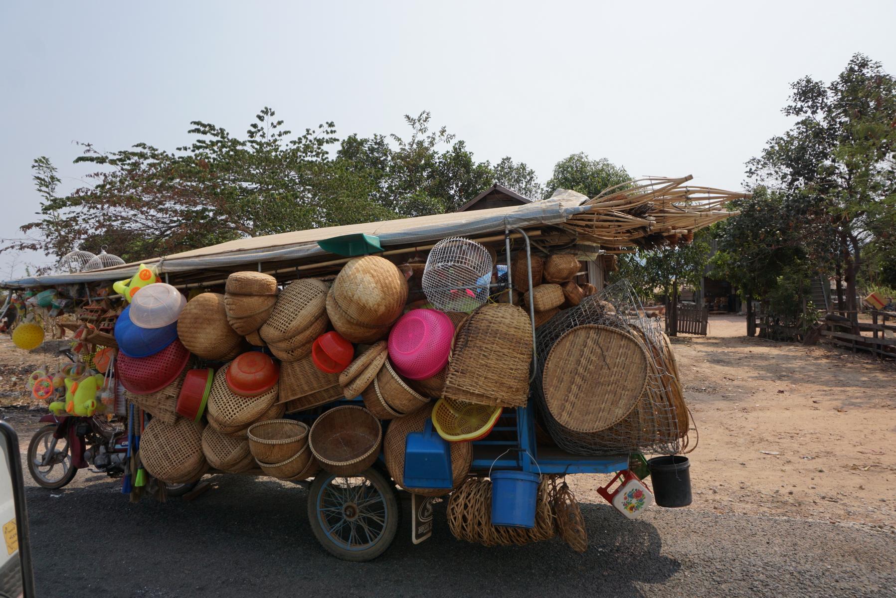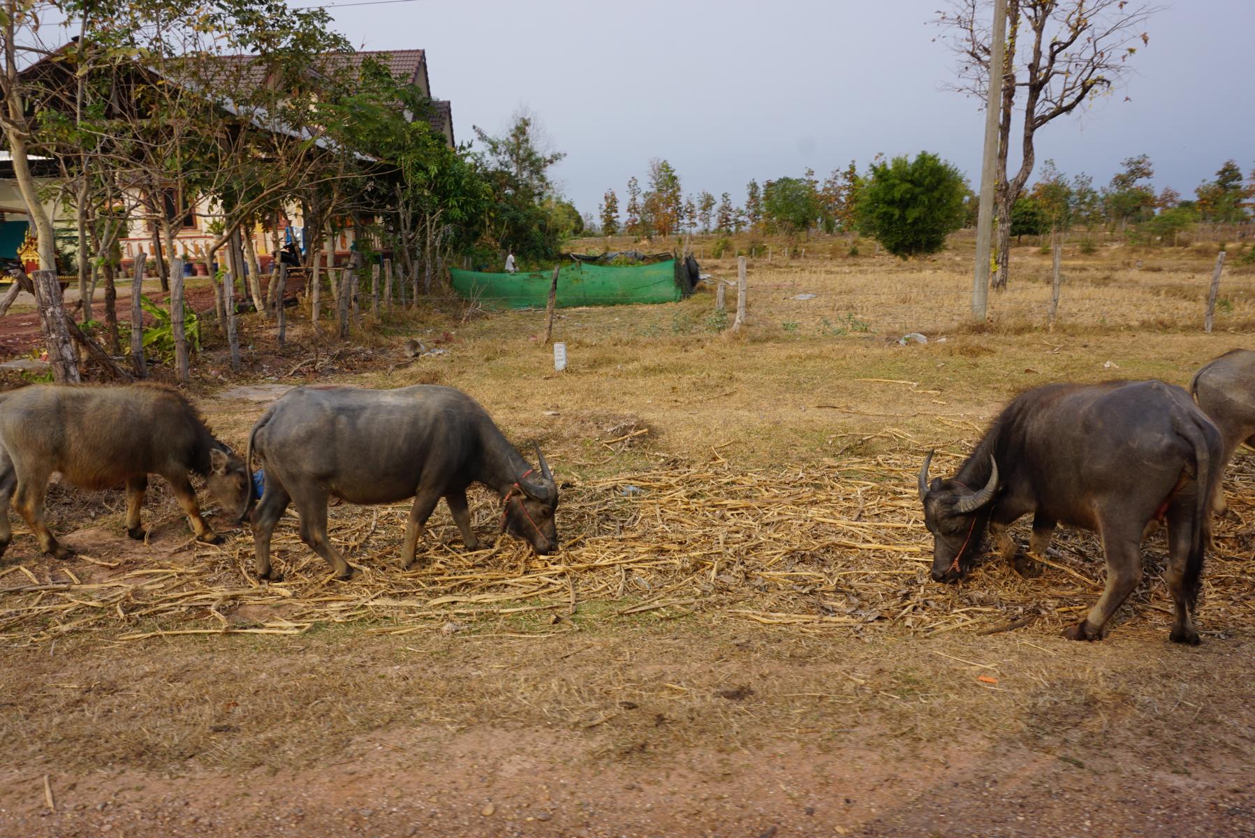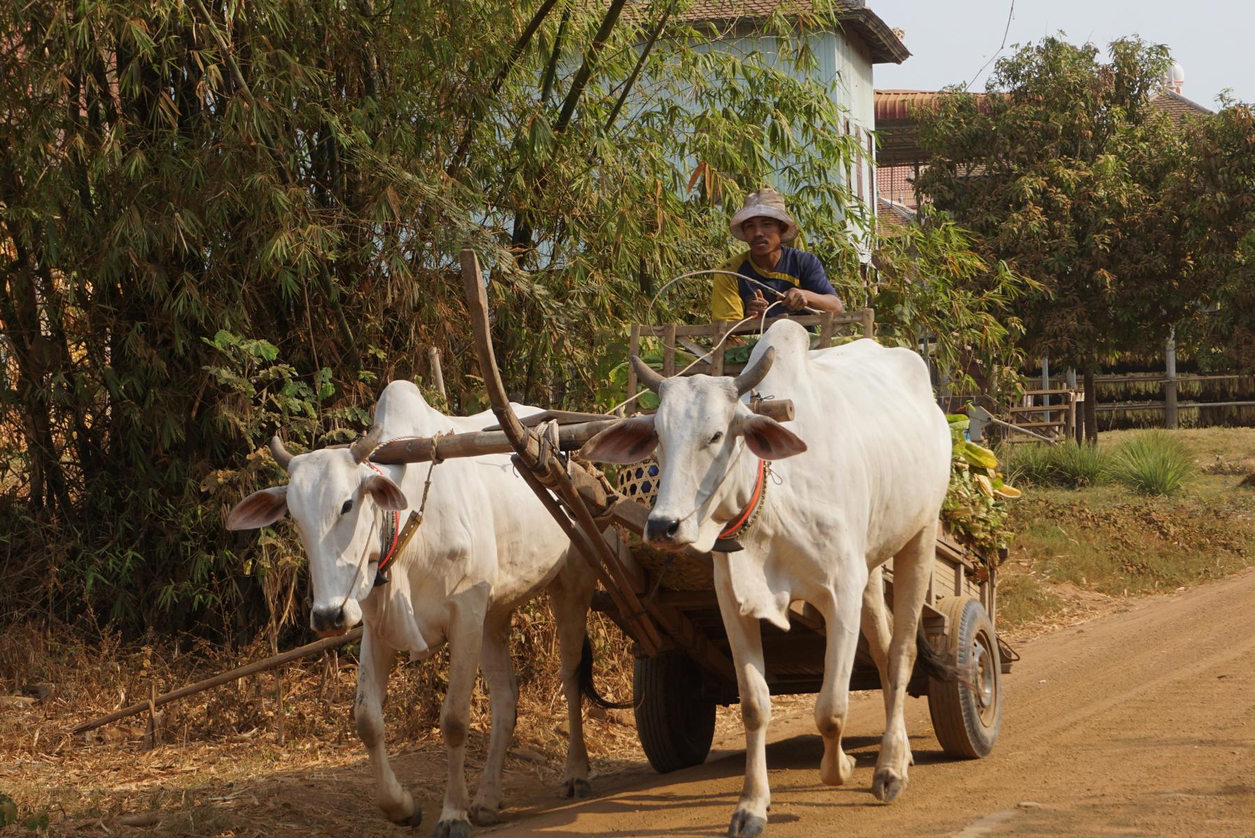 Die letzten Kilometer in Kambodscha sind geprägt von Staubstrassen, kratergrossen Löchern, die Holzhäuser werden kleiner und einfacher. Am Strassenrand verkaufen Frauen Reiseproviant, die Reisen in den prall gefüllten Minibussen dauern ewig. Sie sind vollbepackt mit Menschen und alles was im Innern nicht mehr Platz findet, landet auf dem Dach – inklusive Moped.