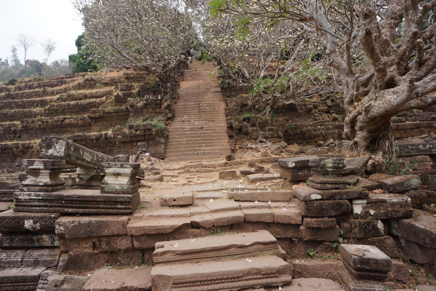 Wat Phou, die Tempelstadt steht auf dem Programm. Der Bergtempel stammt aus der Herrscherzeit der Khmer und soll noch vor Angkor entstanden sein. Eine von knorrigen Frangipani-Bäumen gesäumte steile Steinterrasse führt zu den weiteren Ebenen der Kultstätten. Im zentralen, einst Shiva geweihten Heiligtum thront ein grosser Buddha im Lotussitz. Die Ruinen von Wat Phou zählen zu den bedeutendsten archäologischen Stätten Laos.