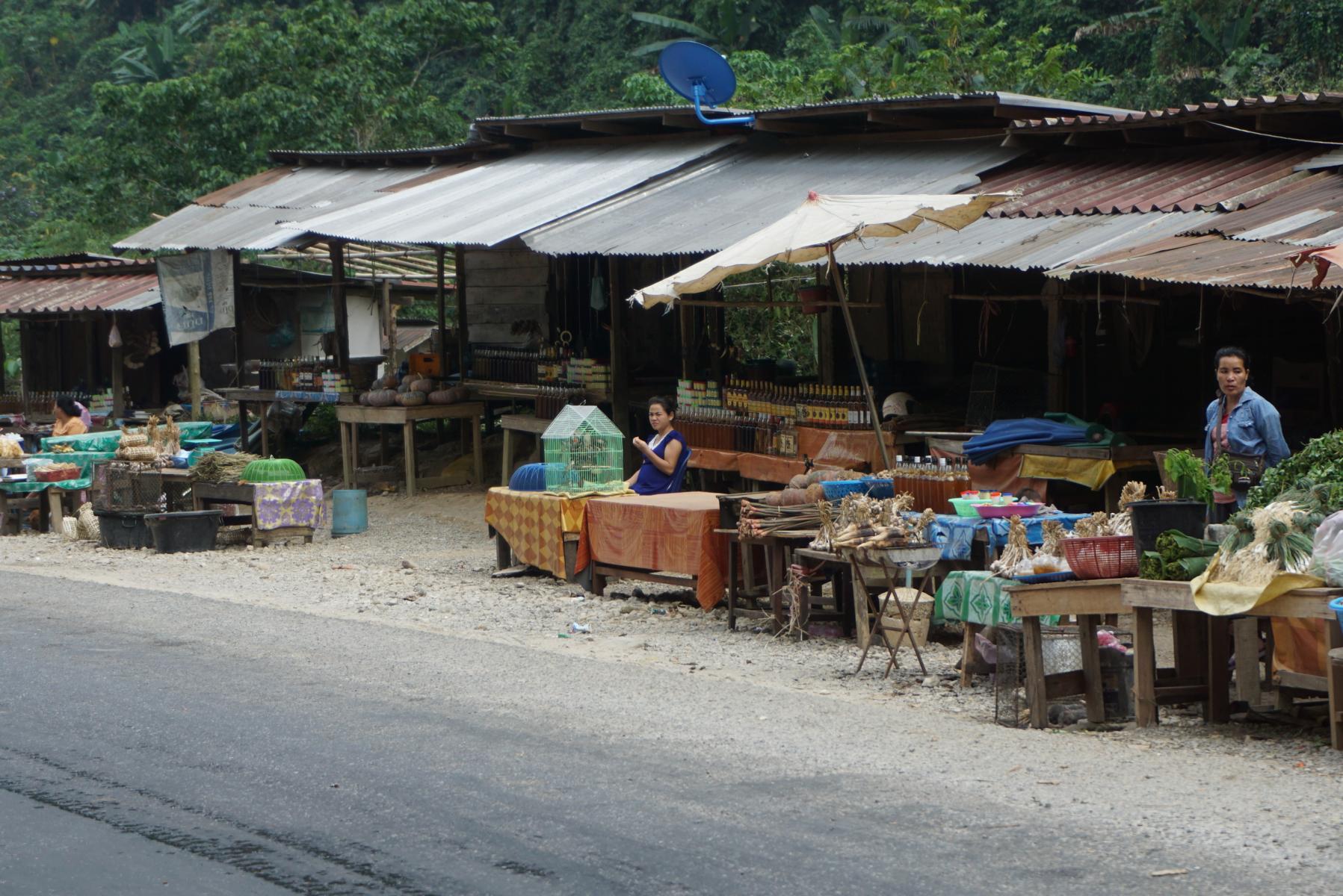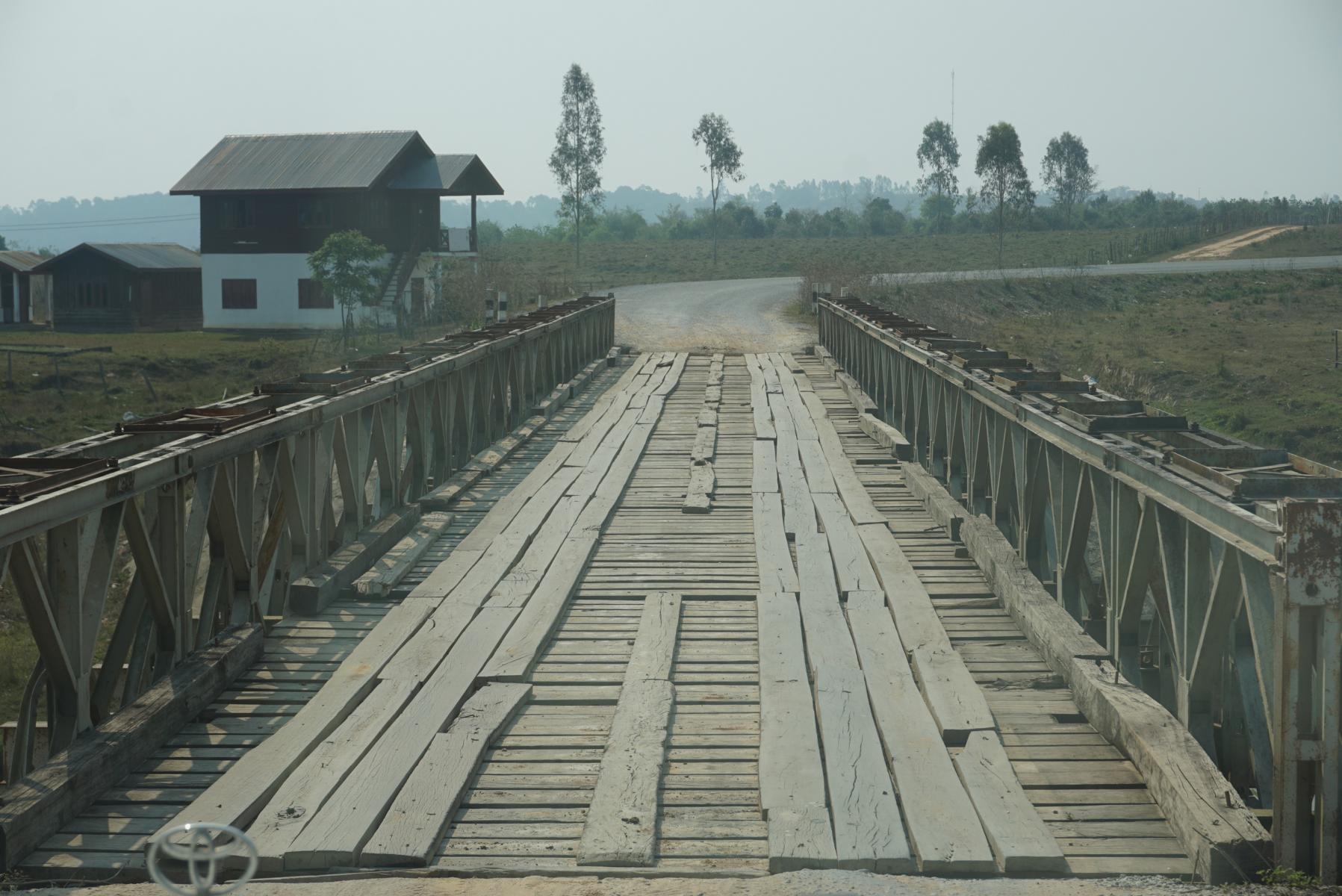 In Laos ist es recht schwierig, einen Übernachtungsplatz zu finden.  Es führen keine Wege von der Strasse weg, die Reisfelder reichen meist bis an den Strassenrand. Da sind wir doch froh, noch rechtzeitig vor Einbruch der Dunkelheit eine Ausfahrstelle in luftiger Höhe zu finden.