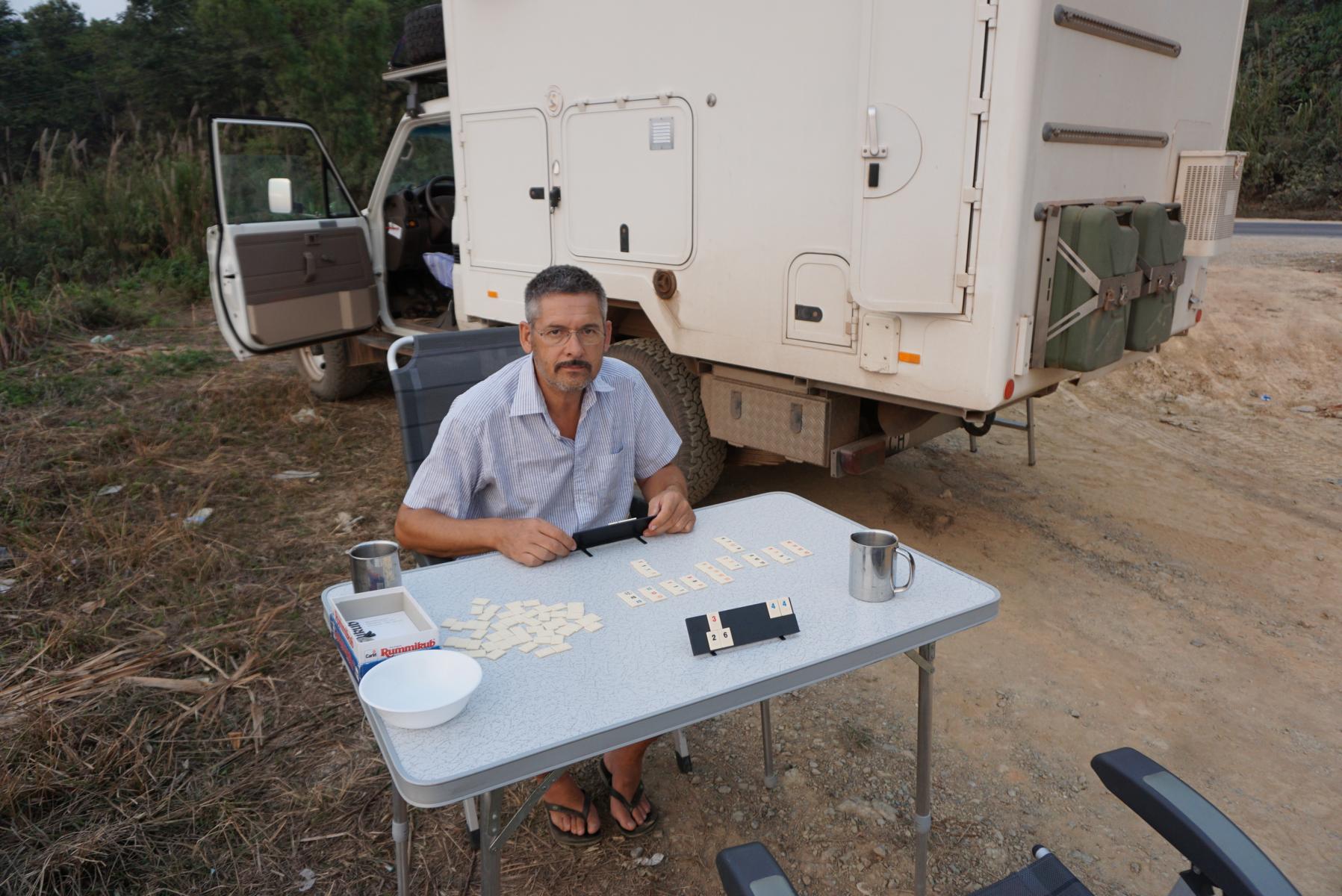 Es ist zwar ein Müllhaufen um uns herum doch wir machen es uns gemütlich. Gerade wollen wir uns ins ‚Haus‘ zurückziehen, da kreuzt ein Soldat mit Gewehr auf. Es folgt ein stummes Mimikgespräch zwischen ihm und Urs. Nein, da könnt ihr nicht schlafen, wir schiessen, – doch, doch das können wir, du aufpassen, wir schlafen – nein nicht schlafen, wir schiessen vom Berg hinunter – und so geht’s noch ein paar Mal hin und her. Wir müssen wegfahren. Kiesgruben sind schon ein paar Mal unsere Rettung gewesen und so auch diese Nacht. Allerdings fahren Mopeds ein paar Mal ums Auto herum, so ganz geheuer ist es uns dann doch nicht. Urs hört in der Nacht auch das Schiessen, scheinbar haben sie eine Übung vom Berg hinunter auf den strategisch wichtigen Parkplatz, den wir eingenommen haben.
