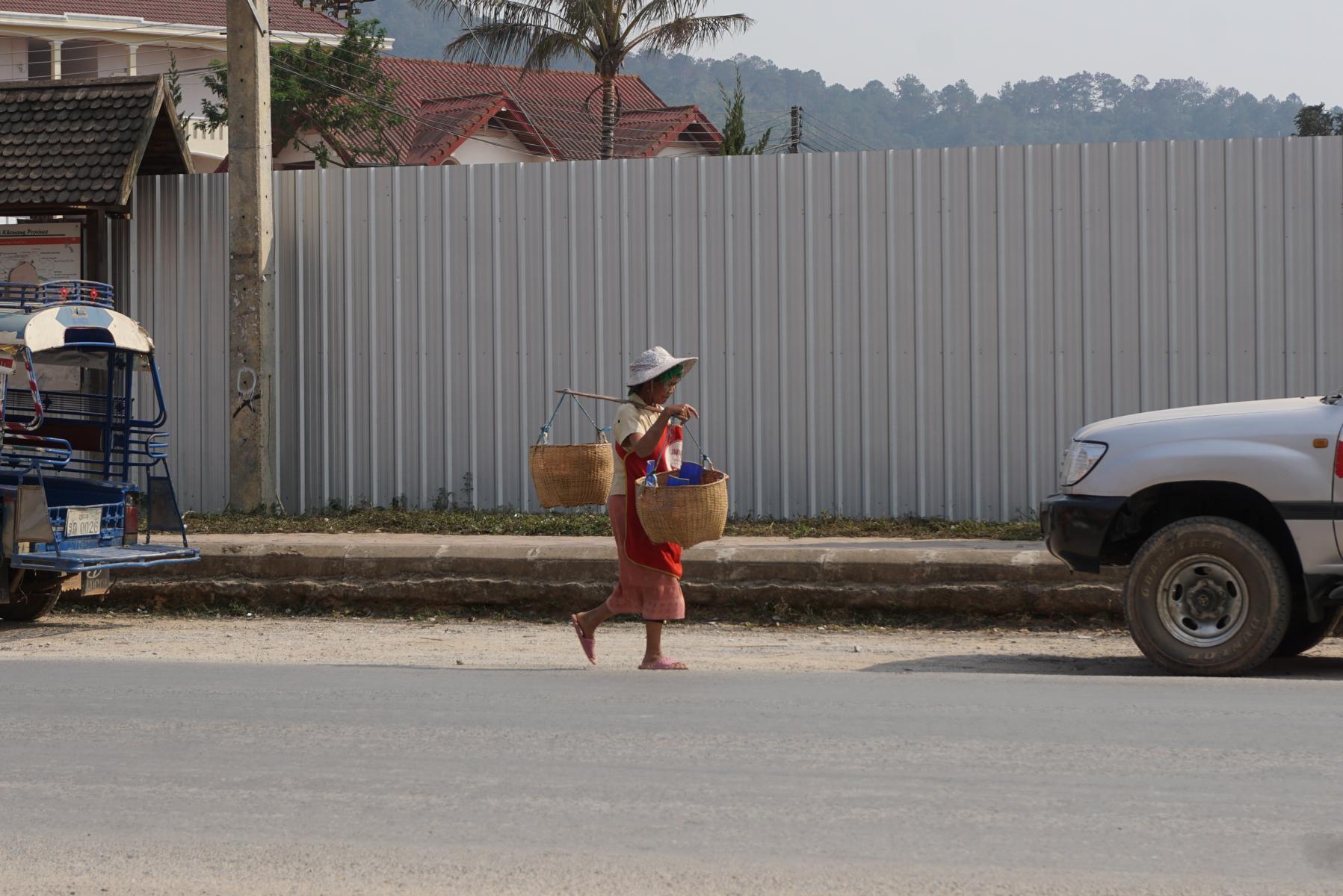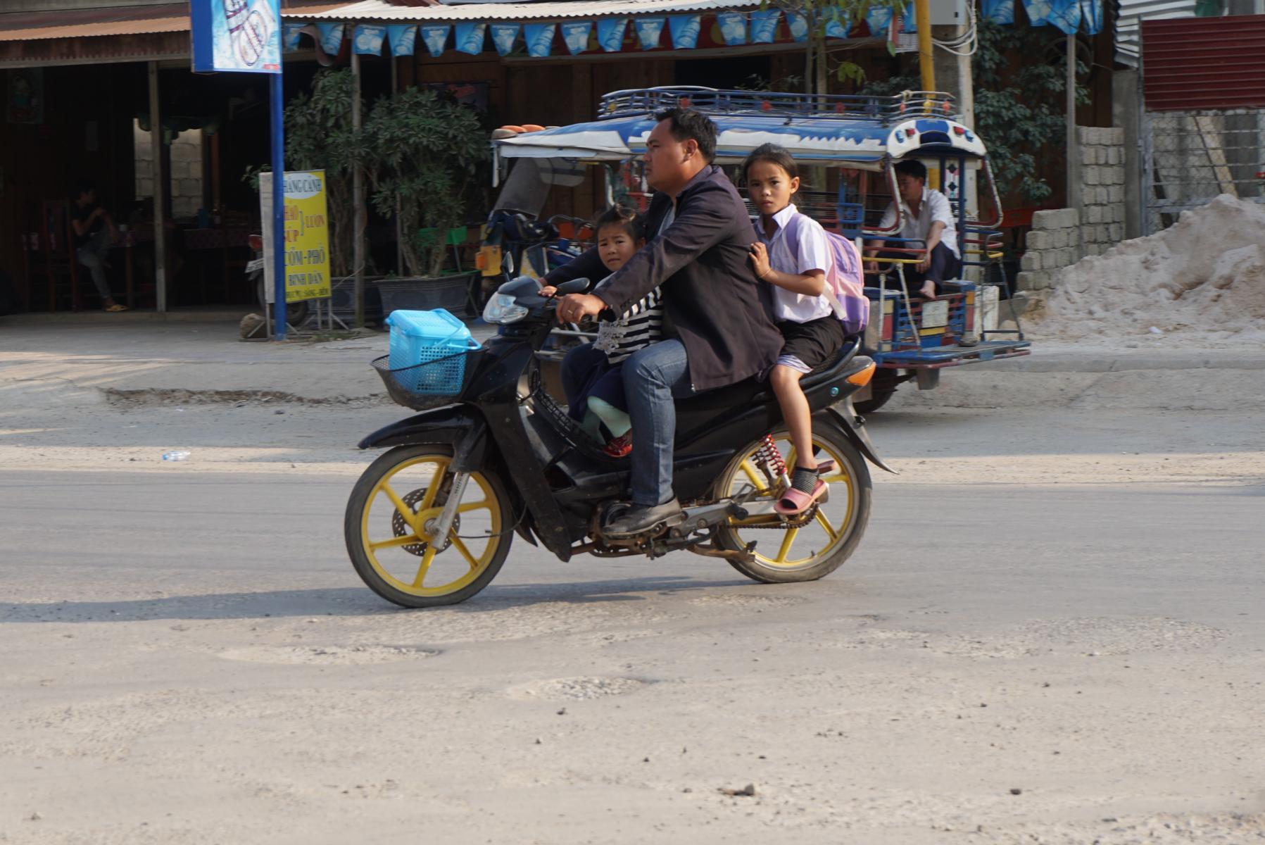 Um halb Sieben fahren wir schon los. Die Kinder sind bereits auf dem Schulweg, zu Fuss oder mit dem Velo laufen oder fahren sie kilometerweit bis ins nächste Dorf, wo die Schule steht. Ein längliches Gebäude mit ein paar Fenstern und Türen und einem grossen Schulhof. Dunkles Unterteil, weisses Hemd, meist nicht mehr so blütenrein, ist die Schuluniform. Die Mädchen tragen den traditionellen dunklen Jupe der Laotinnen mit einer breiten Borte am Saumrand und einer vorderen Falte . Die meisten Frauen sind sehr schön und sauber gekleidet. Erstaunlich, wenn wir die einfachen Hütten sehen und die Dorfwasserleitung, von der das Wasser in die Häuser getragen oder gefahren wird. Das Wäschewaschen und das Duschen findet auch an dieser Wasserversorgungsstelle statt.