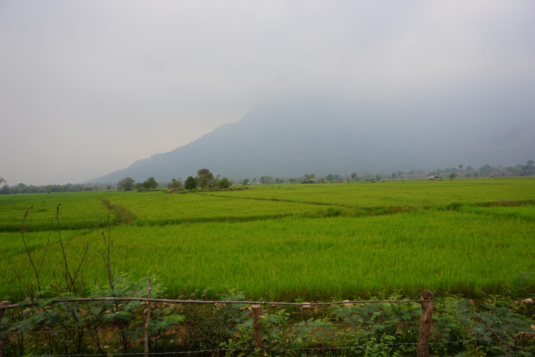 Die Mehrheit der Reisfelder liegen brach und warten auf die Regenzeit. Ein bewässertes Feld mit seinem hellen Grün fällt richtig auf.