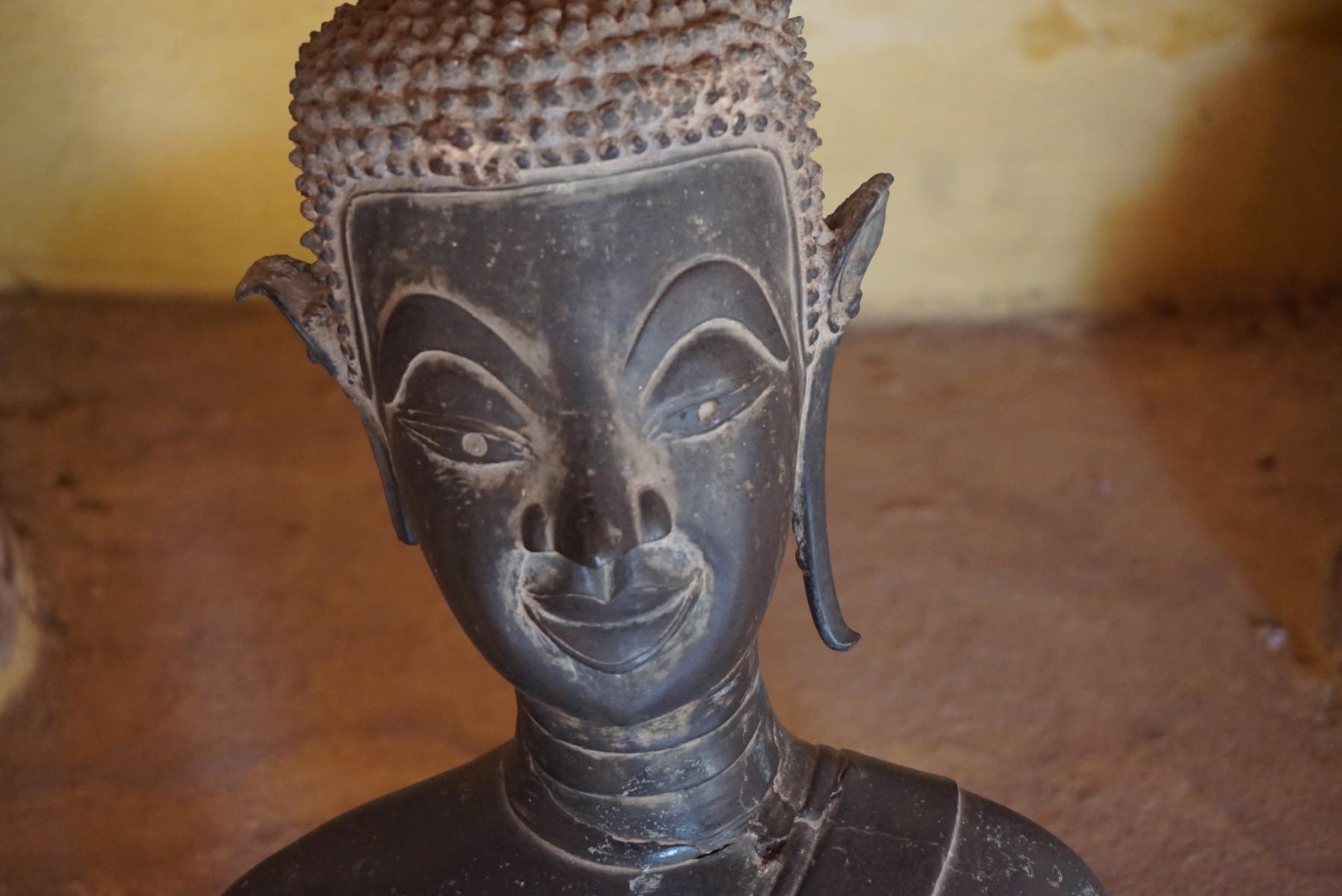 Der Laos Buddha hat ein freundlich-verschmitztes Gesicht. Auf den Haaren türmt sich eine Spitze in Richtung Himmel.