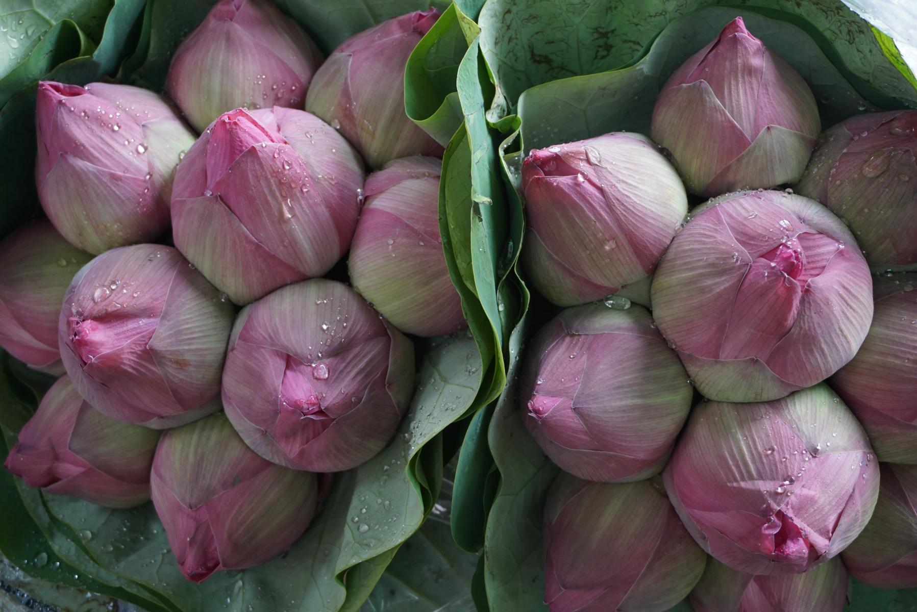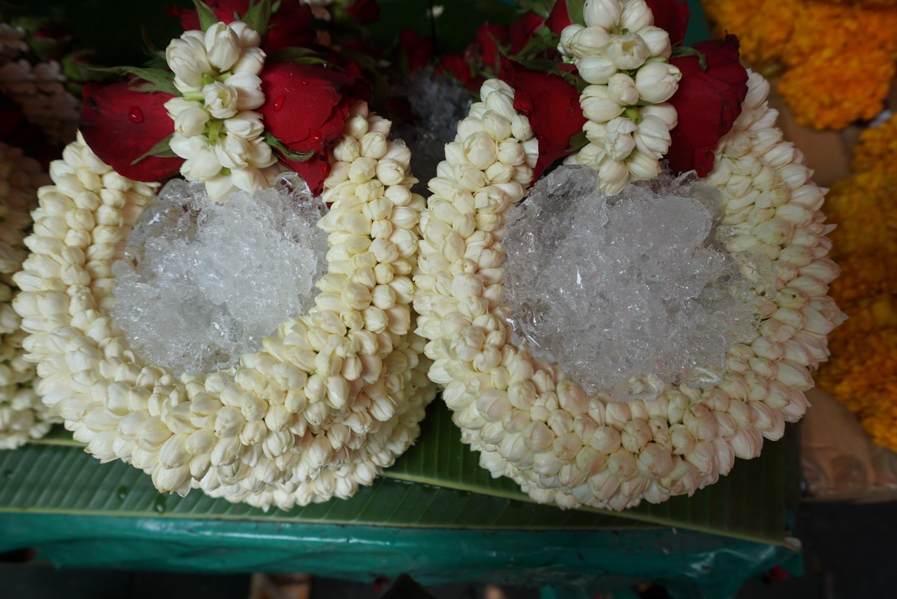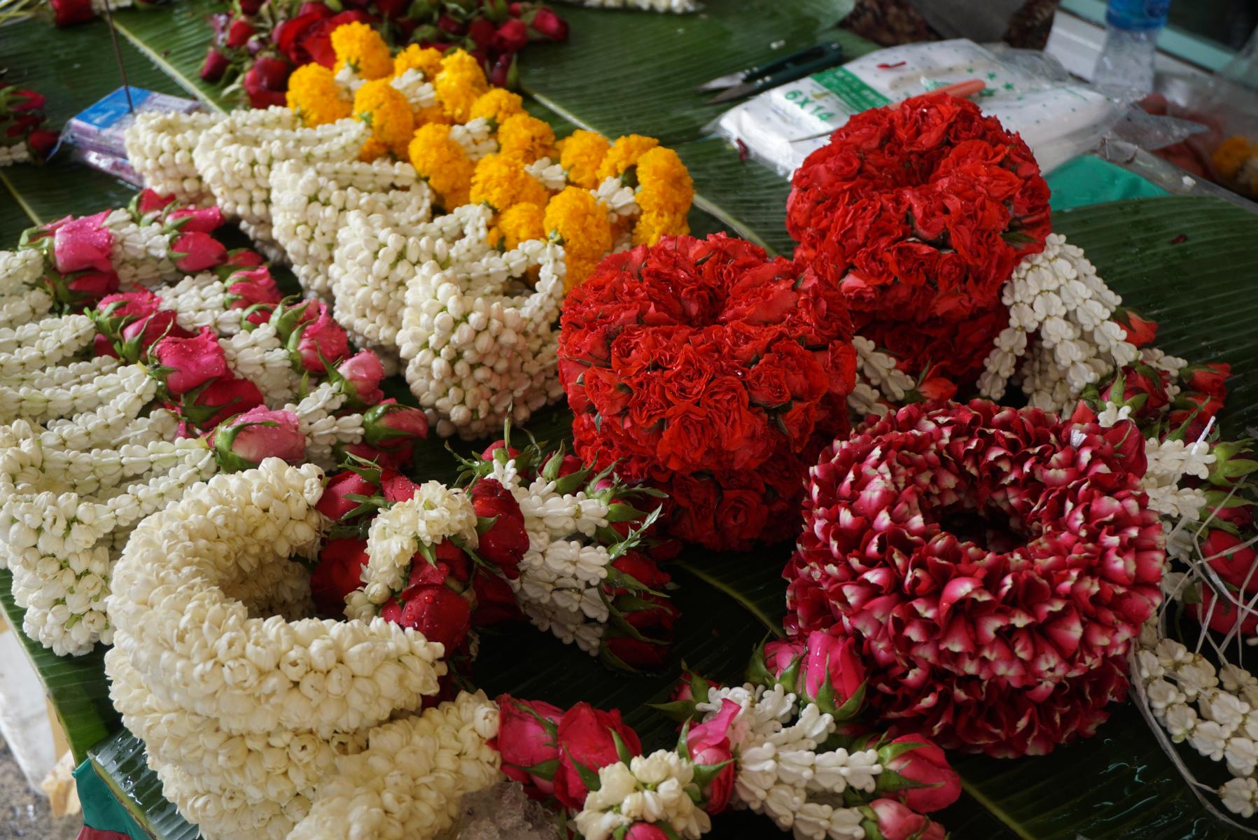 Intensiver Duft von Jasmin strömt uns auf dem Blumenmarkt entgegen. Die Frauen verarbeiten ganze Säcke voll Knospen zu kunstvollen Blumenketten. Die heilige Buddha Blüte Lotos in weiss oder rosa und Orchideen in zarten Pastellfarben versetzen uns in entzückte Stimmung.