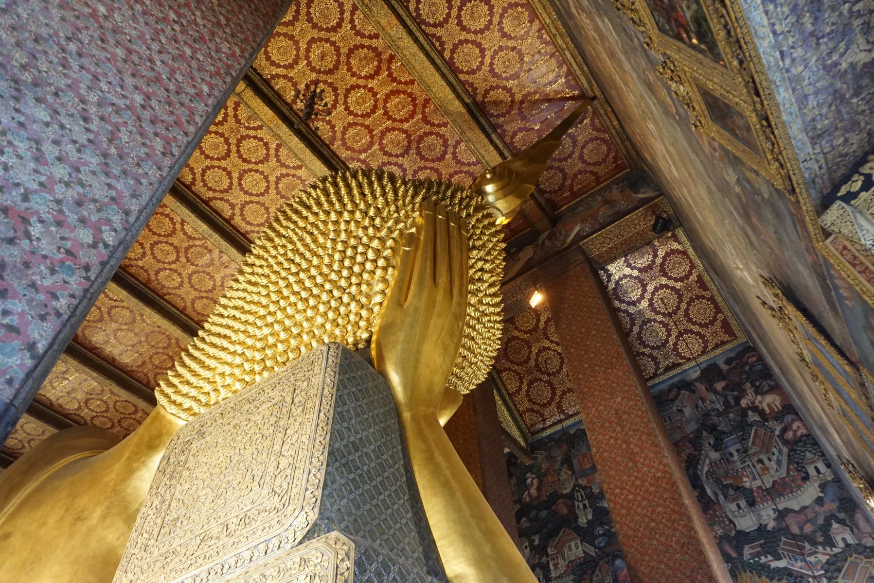 Im Wat Pho ruht der vergoldete, 46 Meter lange und 15 Meter hohe liegende Buddha. Die imposante Grösse löst ehrfürchtiges Staunen aus. Die Tempelanlage quillt über mit künsterlerischen Stupas, verzierten Gebäuden und Buddha-Statuen.