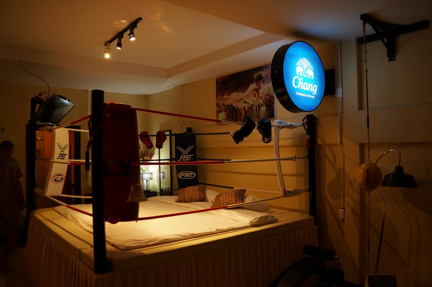 Jetzt reisen wir wieder zu dritt und schrauben die Ansprüche zurück. Es kann ja nicht immer so luxuriös weitergehen. In Chumphon steigen wir im Retro Box Hotel ab – ein Containerhotel. Die lustigen Retro-Dekorationen machen das Hotel zu etwas Besonderem. Unser Bett ist als Boxring ausgestattet, mit Reklametafeln und Trainingsecke. Für mich als Sportmuffel etwas gewöhnungsbedürftig, doch Urs muss gleich die Boxhandschuhe überziehen.