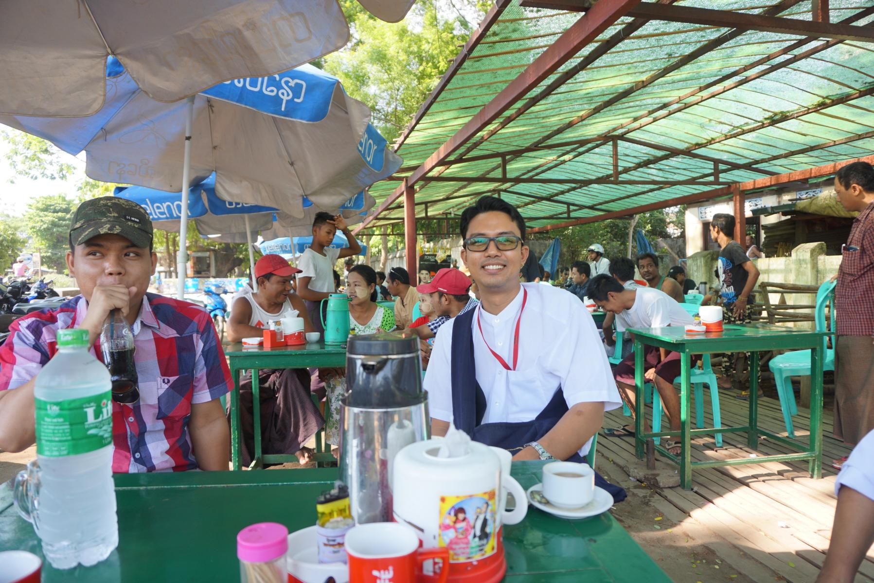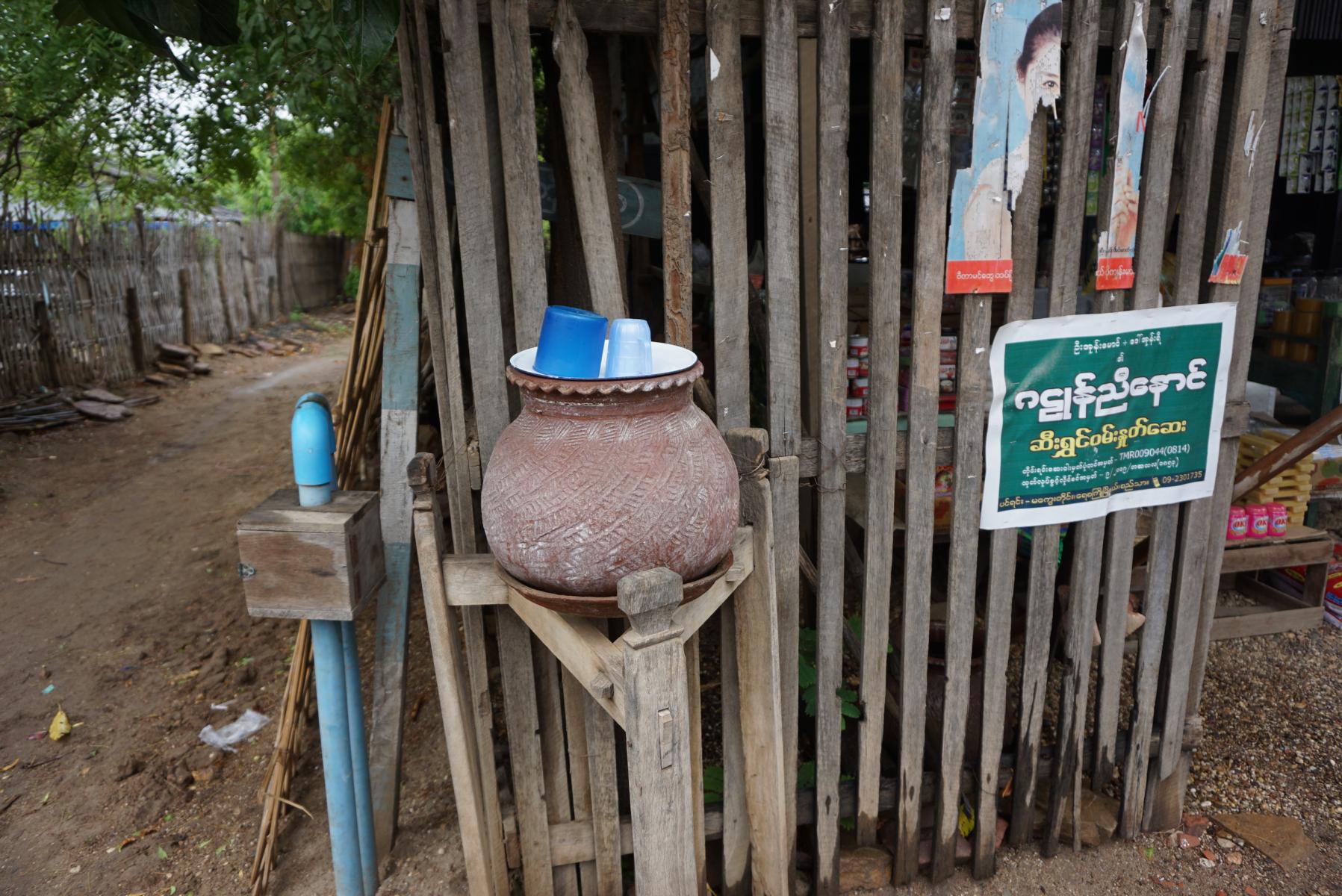 Durst muss in Myanmar niemand leiden. Auf dem Weg stehen überall Tontöpfe mit Wasser gefüllt, die alle benützen können. Ein Becher liegt auf dem Topf parat. Doch wir bleiben bei unseren Wasserflaschen. Oder bei einem Tee in der Teestube. Hier geht es etwas roh zu und her, der Boy reagiert nur auf Zungenschnalzen. Ob ich hier die Magenkäfer aufgelesen habe?