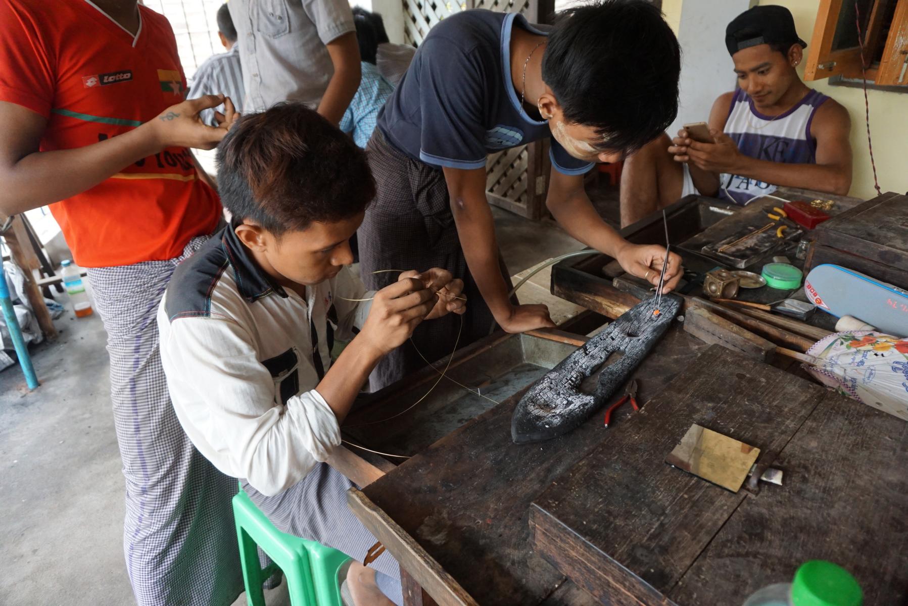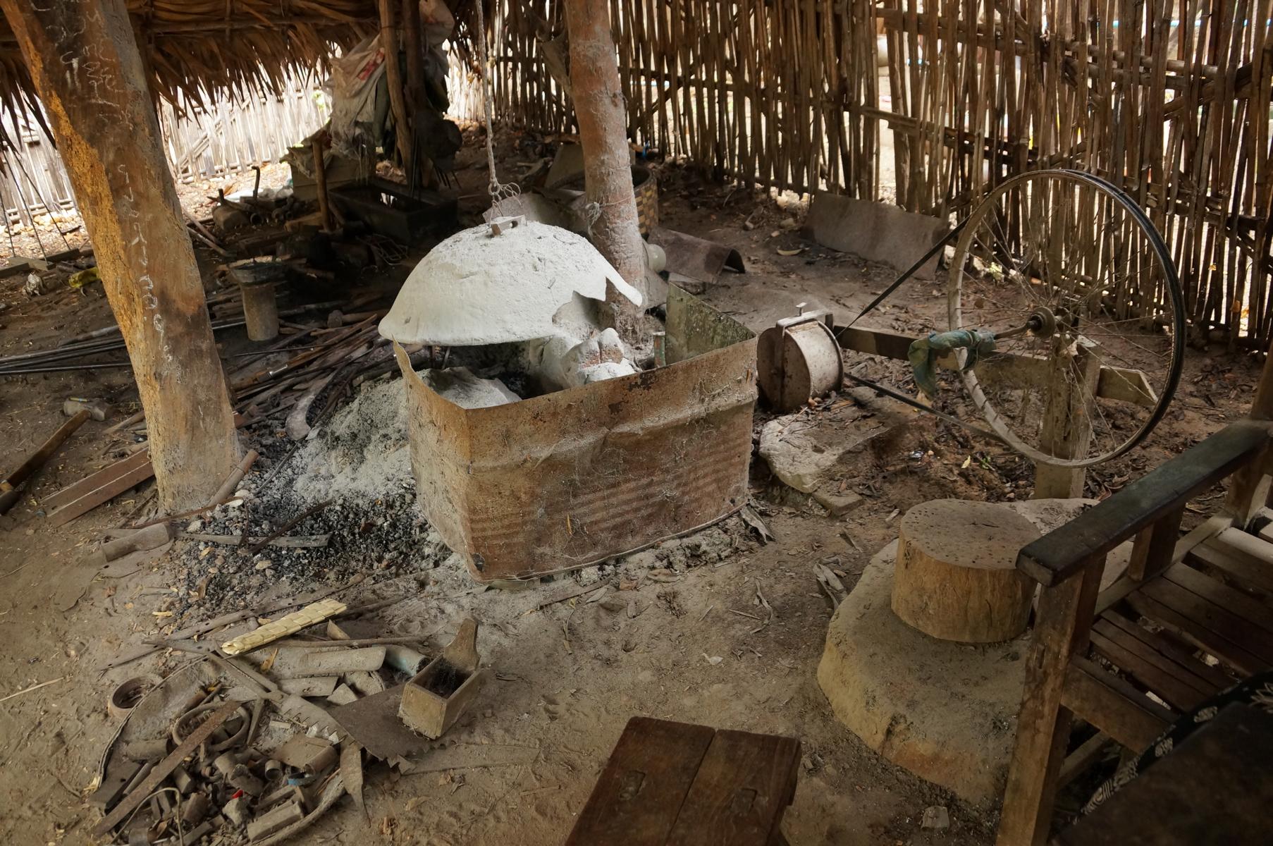 Im kleinen Dorf Ma-u-ale können wir in die Goldschmiedewerkstätten schauen. Dieses Dorf ist bekannt für diese Kunst. Jeder guckt dem anderen über die Schulter und lernt so das Handwerk. Ein Messerschmied in einer open-air-Werkstatt schmiedet alte Blattfedern zu Macheten. Das Dorf lebt wie vor 200 Jahren, die Strassen sind vom Regen aufgeweicht, im Hof stehen zwei, drei weisse Kühe, in den dunklen Bambushäusern wohnen die Leute. An einer Nähmaschine schnurpfen ein paar Mädchen Kleider zusammen, vor dem Laden rollt ein Mädchen auf einer Handmaschine Räucherstäbchen. Man fühlt sich in eine andere Zeit zurückversetzt.
