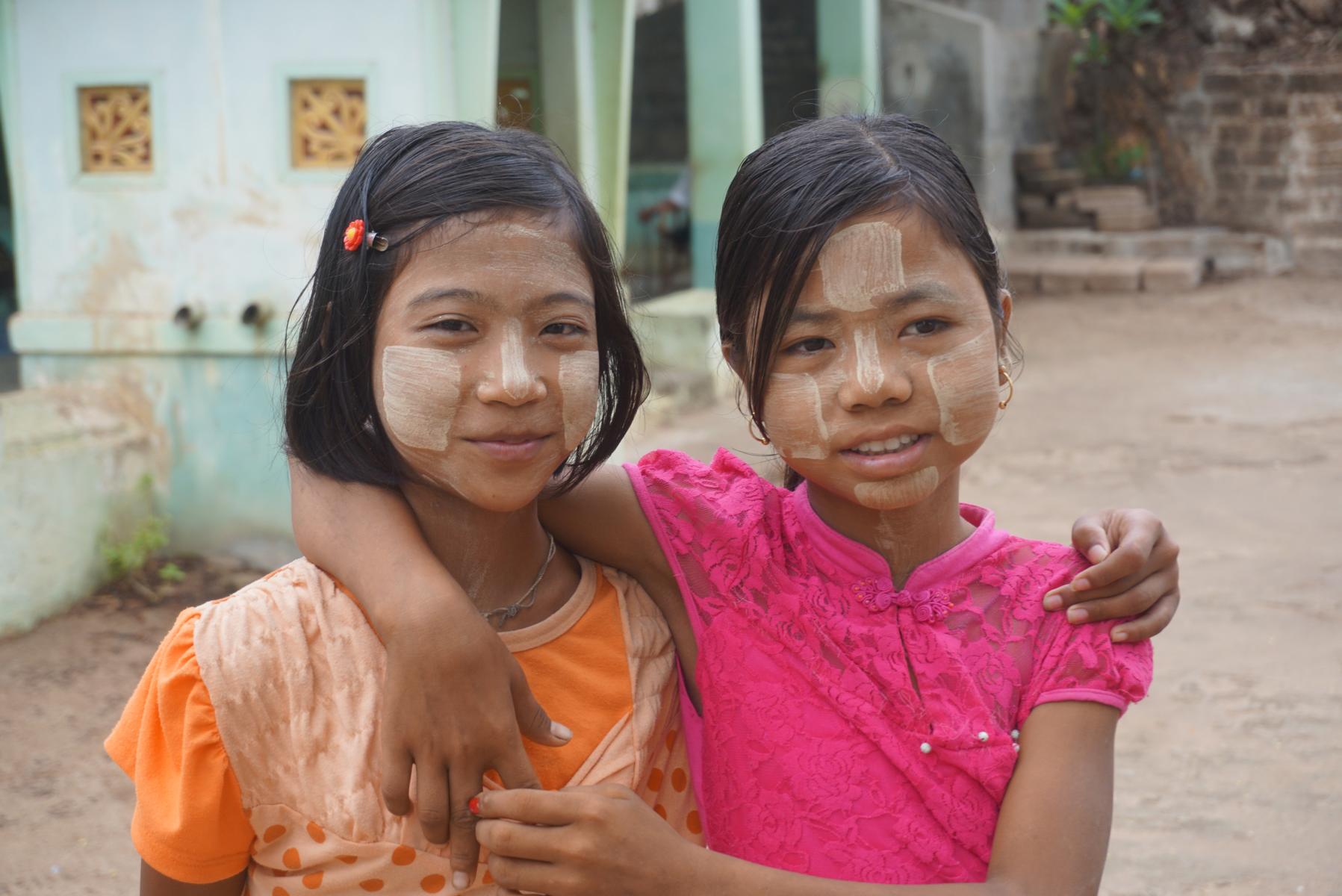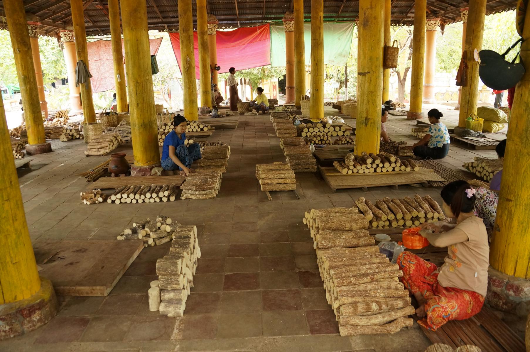 Aus der fein geriebenen Baumrinde entsteht die Thanaka Paste, die von Frauen, Kindern und Männern als tägliches Make-up benützt wird. Die gelblichen Verzierungen auf Wange, Nase und Stirn sehen lustig aus, sie kühlen die Haut und dienen als natürlicher Sonnenschutz. Die Baumstücke und Schleifsteine sind auf jedem Markt zu finden.