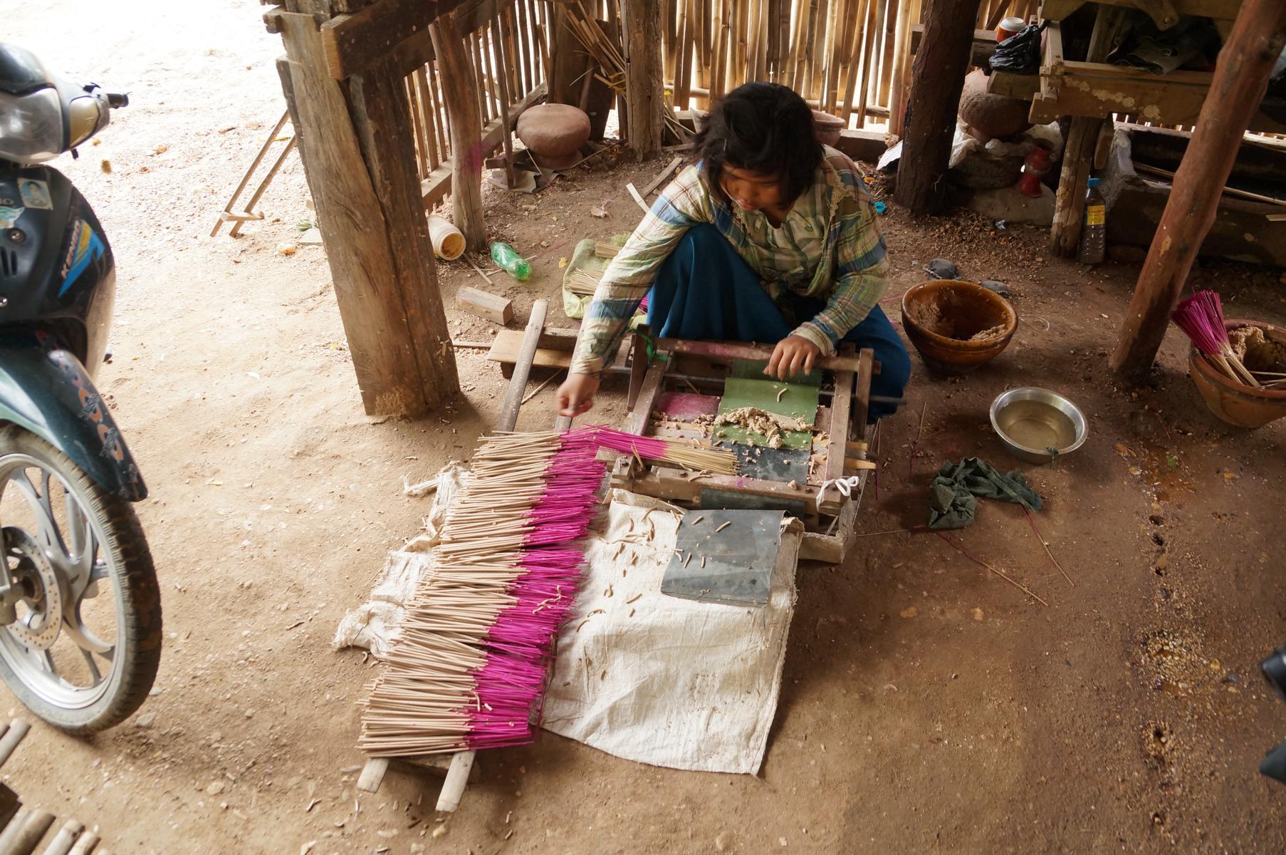 Cheroot sind die Zigarren von Myanmar. Die Frauen sitzen am Boden, sortieren Blätter, schneiden sie zu, präparieren Filter aus Zeitungspapier entweder mit den Blättern der Zigarrenhülle oder Mais. Ein Knabe im Spiderman-Anzug hockt in einem Bambussieb und sieht der Grossmutter oder Mutter beim Befüllen der Blätterrollen zu. Die Blätter werden im Staat der Shan als ein Wirtschaftszweig angebaut, getrocknet und in grossen Bambuskörben in den anderen Staat zur Verarbeitung geliefert. Die Frau konfektioniert täglich 1000 Zigarren und bekommt dafür 3 US$.