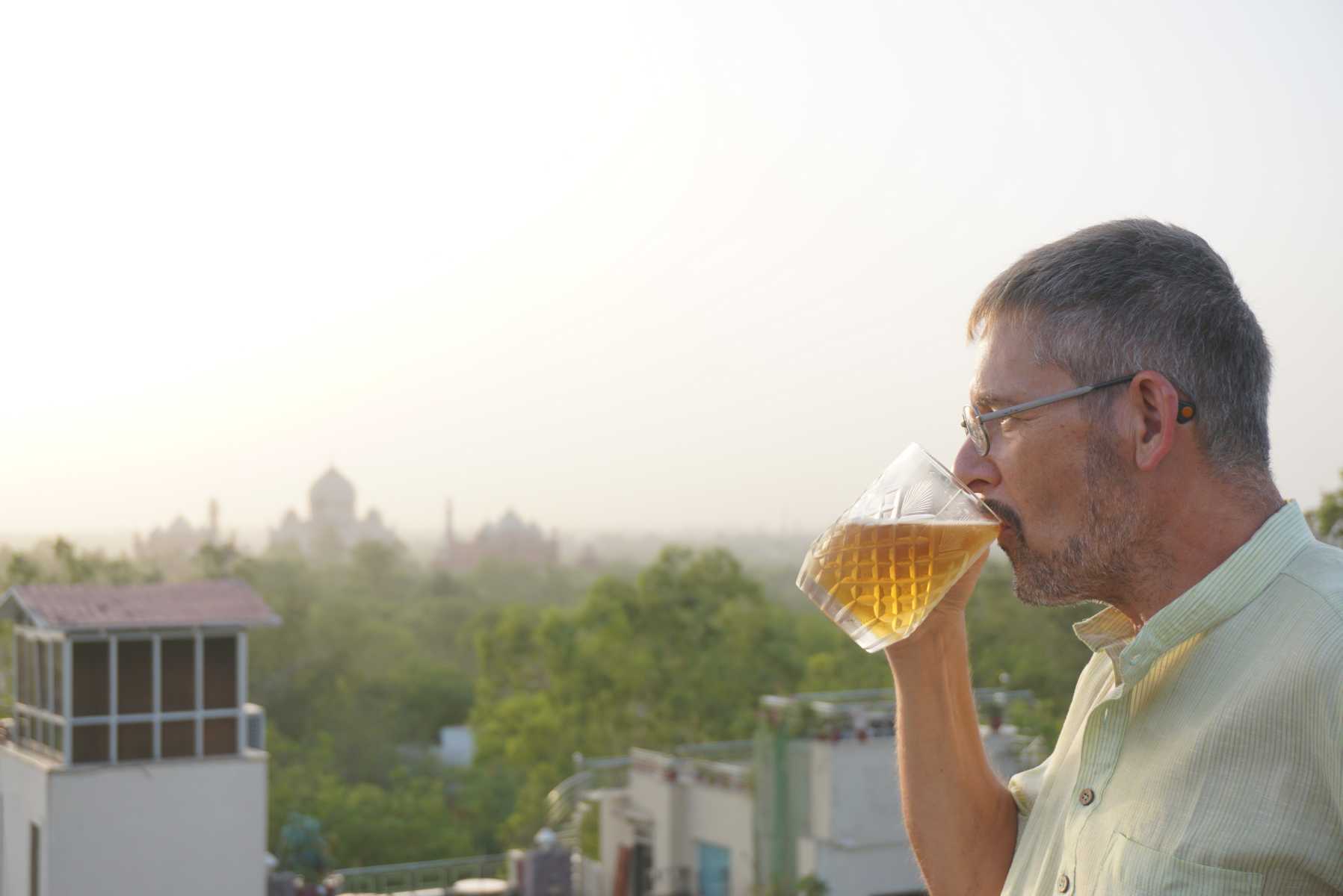 Nach Tagen ein kühles Bier zum Sundowner und erst noch mit dem Taj Mahal im Visier – das hebt unsere Stimmung definitiv.
