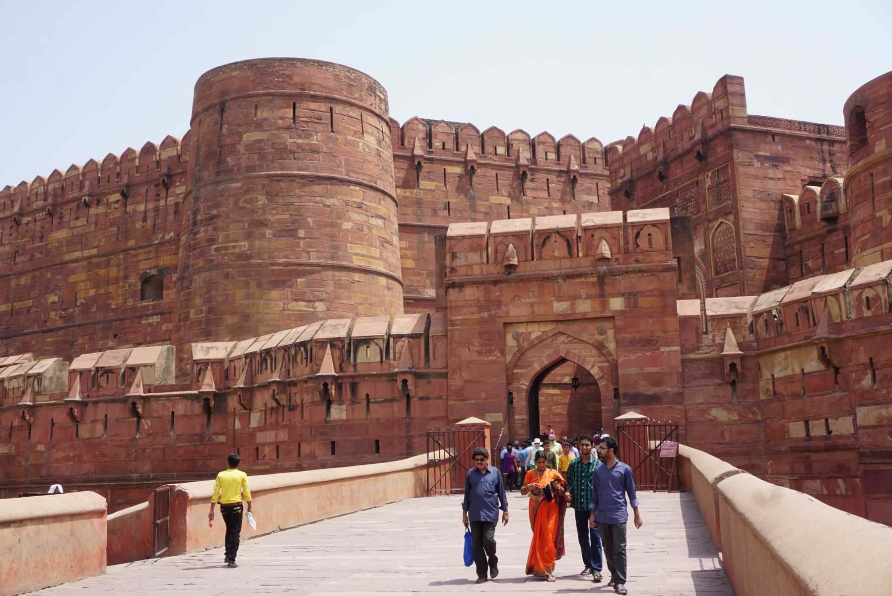 Im 16. Jahrhundert erlebt Agra seine Glanzzeit. Das Agra Fort mit seinen hohen Festungswällen aus rotem Sandstein ragt in einer Biegung des Yamuna Flusses empor.
