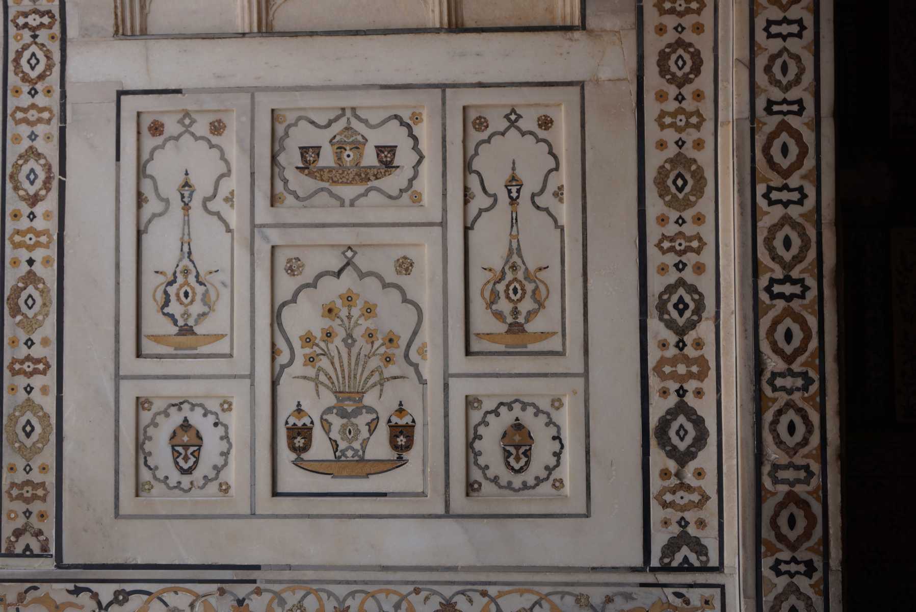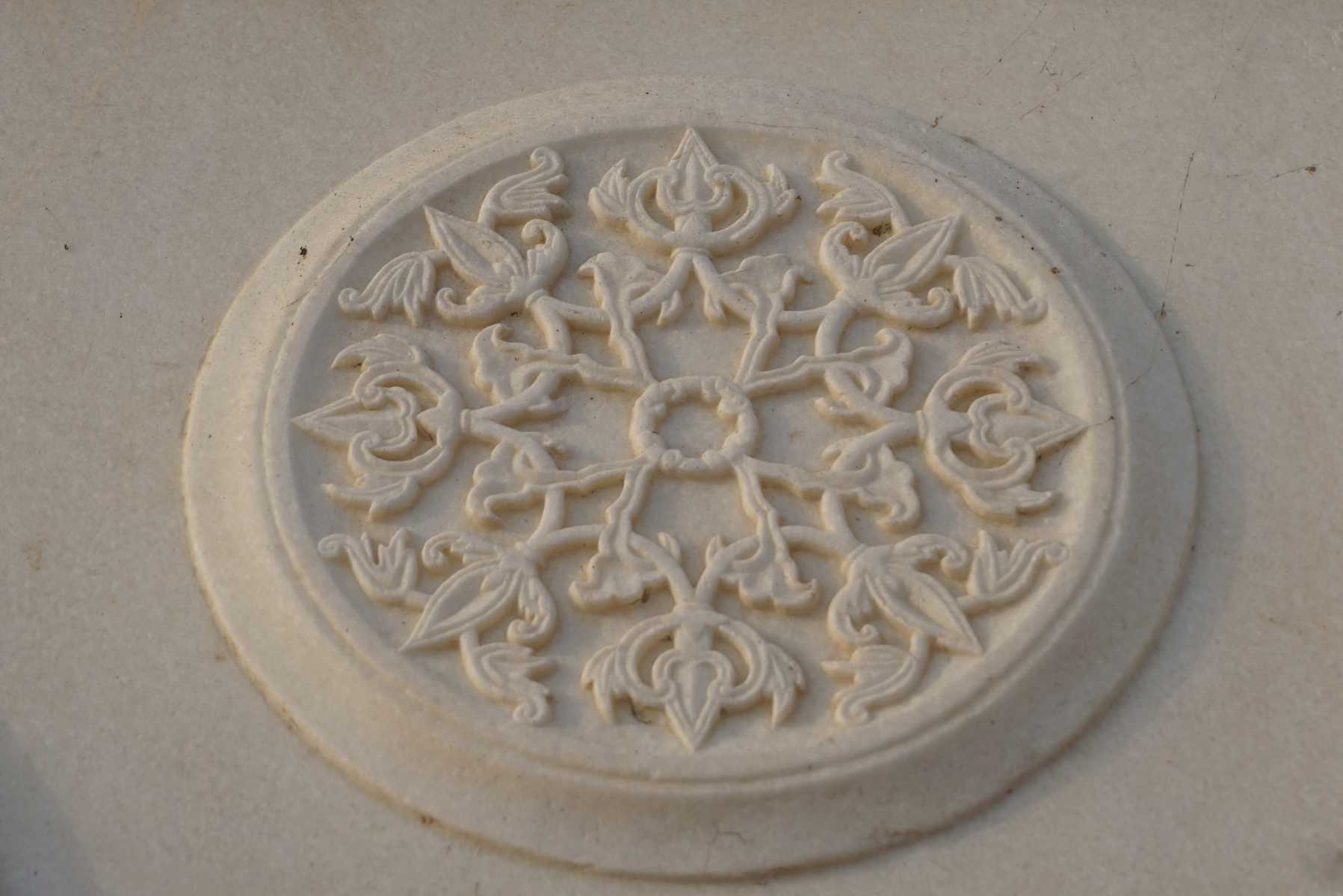 Der Marmor wurde in Rajasthan gebrochen und die Halbedelsteine Onyx, Amethyst, Lapislazuli, Türkis, Jade, Kristall, Koralle und Perlmutt stammen aus Persien, Russland. Afghanistan, Tibet, China und dem Indischen Ozean.