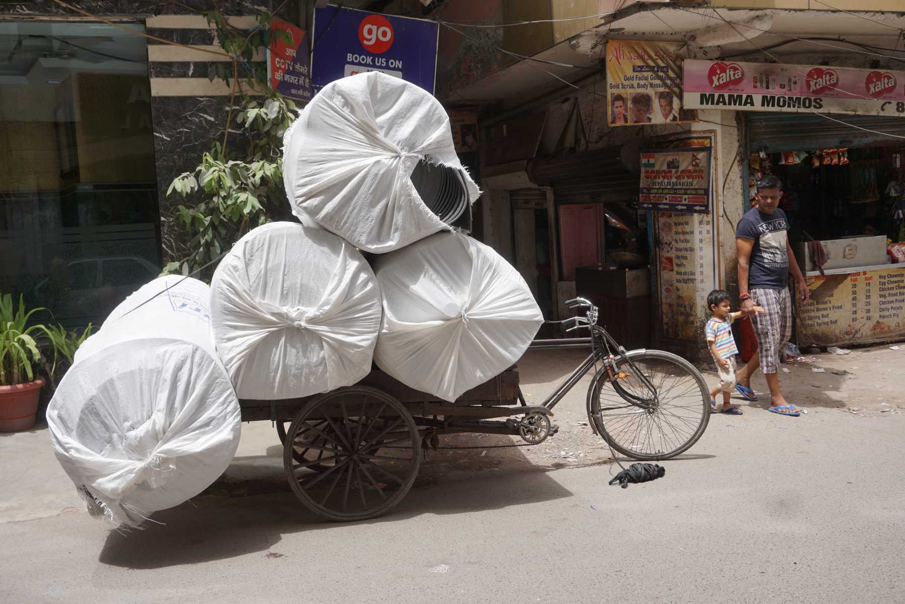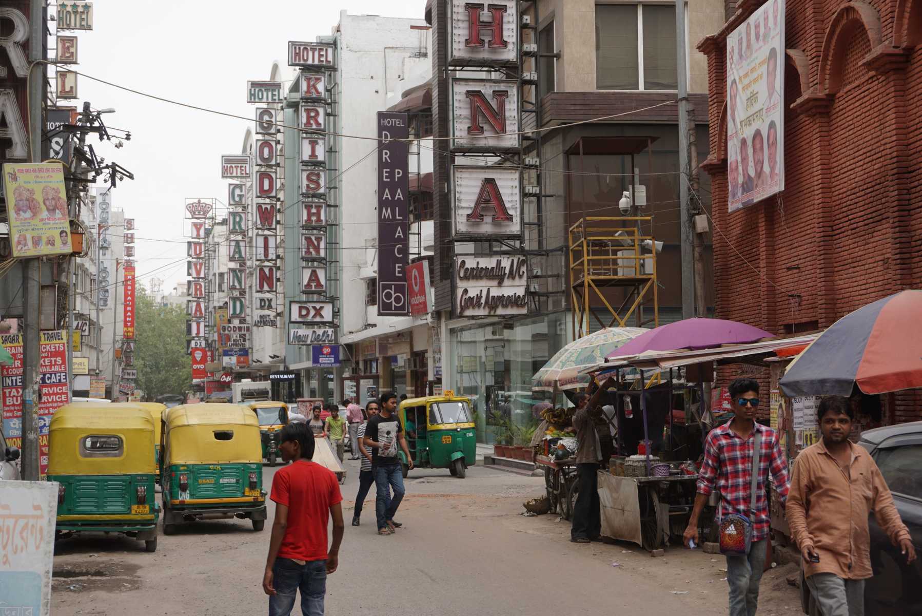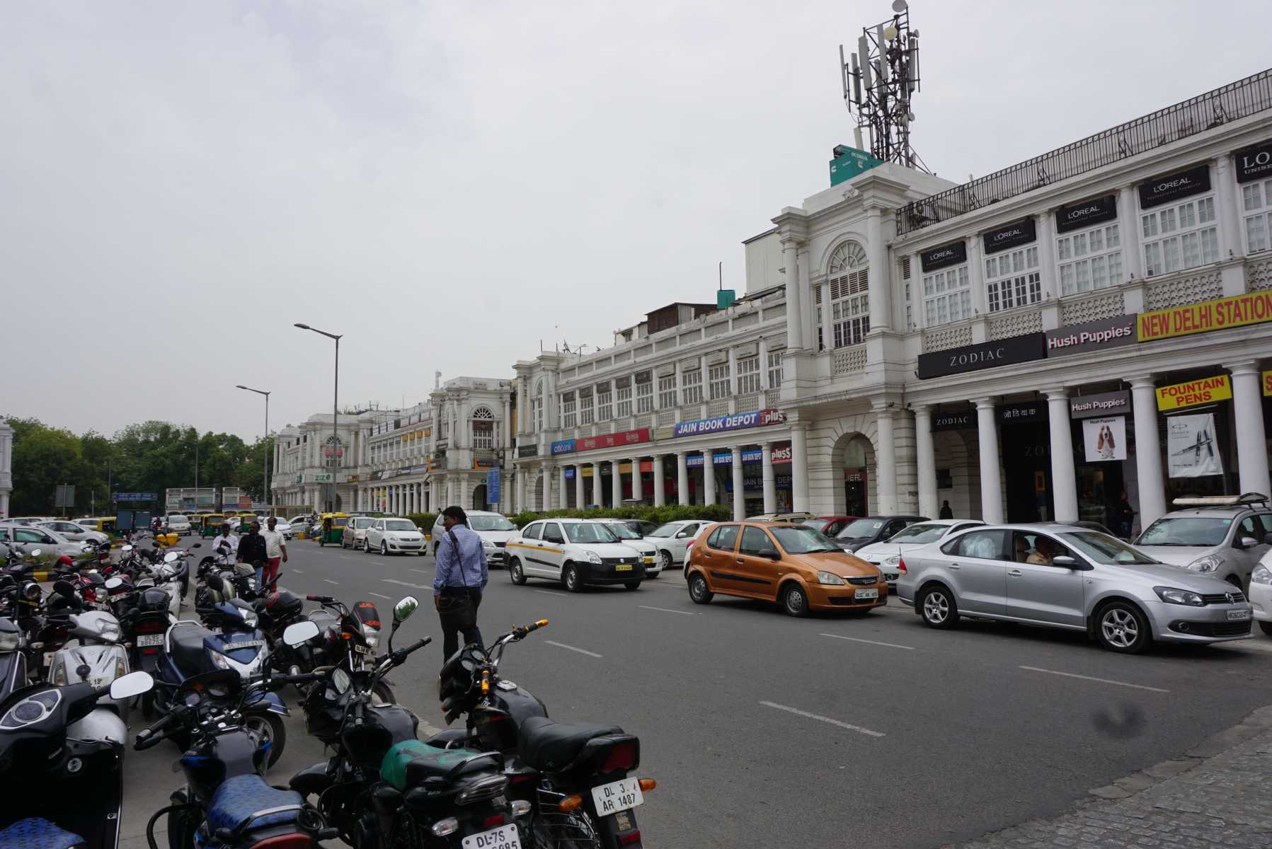 Mitten in New-Delhi befindet sich der Connaught Platz. In jedem der drei weissen Riesenkreisel-Gebäude reiht sich ein Geschäft ans andere. Hunde und Bettler neben Restaurants und Weltmarken.